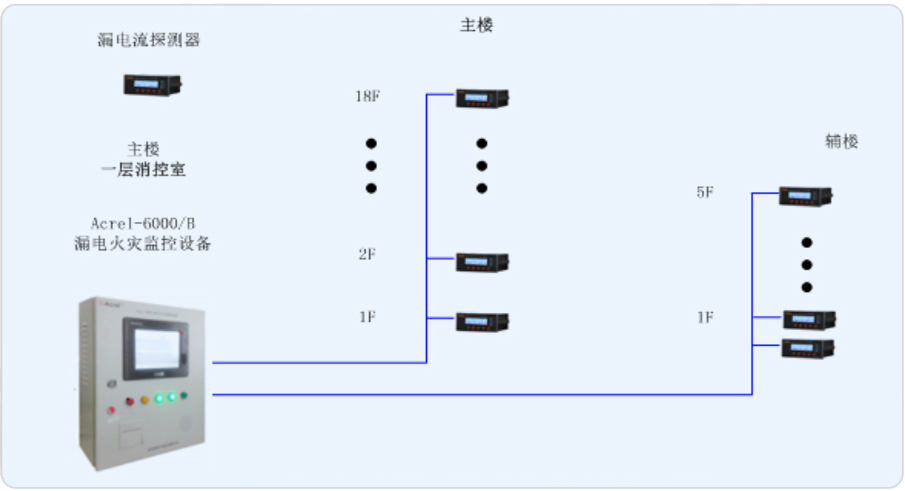 針對(duì)本項(xiàng)目的性質(zhì)及配電結(jié)構(gòu),現(xiàn)針對(duì)其主樓(18層)、輔樓(5層),兩棟樓設(shè)計(jì)一套電氣火災(zāi)監(jiān)控系統(tǒng)。在主樓和輔樓的樓層配電箱的進(jìn)線端安裝漏電流探測(cè)器,由此來實(shí)時(shí)監(jiān)測(cè)變電所內(nèi)重要回路的漏電流,以確保變電所配電系統(tǒng)的電氣安全。
