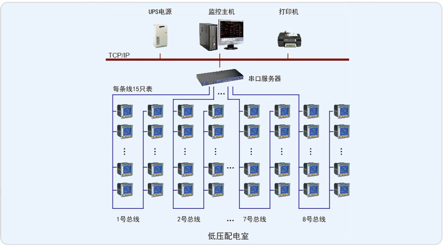 該電力監控系統應實現各配電室各饋線回路電壓、電流、功率、功率因數及頻率等監測信息實時刷新,配電室整體一次圖形式直觀動態顯示;完成對各配電回路的電壓、電流或功率實時和歷史趨勢曲線的繪制,便于分析該回路配電運行工況;完成對各回路的電能集抄功能,并自動生成符合客戶管理需求的用電報表,所有報表或圖表支持查詢打印功能;對各監測點的通訊狀態或異常用電進行報警,便于管理人員實時掌握并分析配電運行情況。
