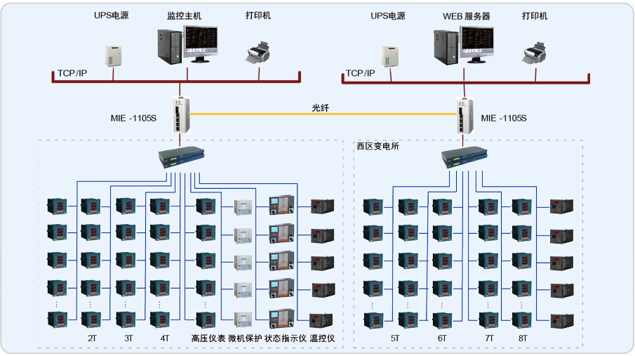 該項(xiàng)目監(jiān)控系統(tǒng)主要實(shí)現(xiàn)吳中商務(wù)中心兩個地下變電所(東區(qū)變電所和西區(qū)變電所)的10/0.4kV配電系統(tǒng)進(jìn)行用電監(jiān)控與電能管理;監(jiān)控范圍為東區(qū)變電所的T1、T2、T3、T4變壓器的低壓進(jìn)線柜、聯(lián)絡(luò)柜、饋線柜及高壓側(cè)儀表和西區(qū)變電所的T5、T6、T7、T8變壓器的低壓進(jìn)線柜、聯(lián)絡(luò)柜、饋線柜儀表進(jìn)行遠(yuǎn)程實(shí)時監(jiān)控和電能管理。