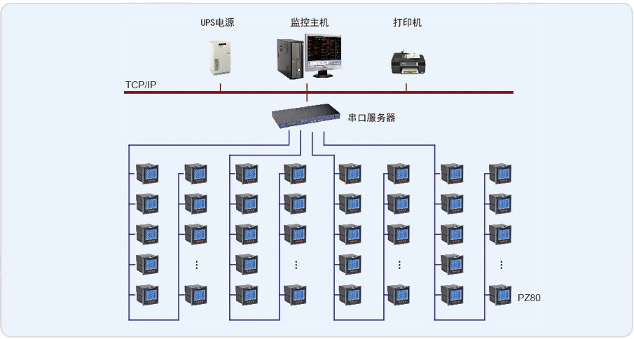 本項目共有一個配電室,位于地下二層,本棟大樓所有供電均從該配電室配出。另外,本工程還配備一臺360KW柴油發電機組,作為備用電源,當市電停電時,從變電所市電開關輔助接點取發電機自啟動信號至發電機組,發電機組自啟動。在低壓配電,共有2兩路低壓配電進線,兩面電容補償柜,一面雙電源切換柜,53路出線回路以及聯絡柜。所有回路安裝安科瑞電氣股份有效公司的PZ系列可編程電測表,對本回路用電情況進行實時采集、處理。