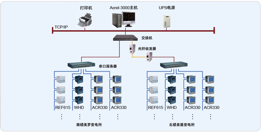該系統(tǒng)總計有352只儀表(其中包括330只ACR網(wǎng)絡(luò)多功能電力儀表,12只ABB綜合保護(hù)裝置,10只變壓器溫控儀),分20條總線,其中北樓泉屋變電所8條總線,南樓美羅變電所12條總線,兩變電所之間距離較遠(yuǎn),采用光纖組網(wǎng)連接,再通過網(wǎng)線拉至南樓美羅變電所值班室連接到監(jiān)控主機(jī)實現(xiàn)總線上儀表與監(jiān)控主機(jī)的數(shù)據(jù)連通。